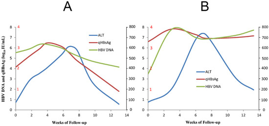 While Nucs are efficient at decreasing the HBV viral load and controlling CHB severity, the issue of addressing hepatitis flares in HBeAg-negative CHB patients remains a major hurdle in the management of CHB. Understanding the immunopathogenesis of flares will pave the way for the development of management strategies. The underlying processes might be revealed by surveying many clinical cases of HBV flares in HbeAg-negative CHB patients during or after Nuc therapy and in those with immunosuppression or immune reconstitution. Regardless of the etiology, all instances of HBV flare initiate from the upsurge in HBV DNA/HbsAg and subsequently elicit an immune response. The exhausted immune cells are rescued by temporal viral suppression through antiviral therapy. After the cessation of antiviral therapy, elements of the innate immune response, including TLRs, NK cells, IFN, and other downstream pathways, and of the adaptive immune response, including CD8+ cells, CD4+ cells, and B cells, contribute to eliciting HBV flares, reflecting a struggle between HBV and the host. Good or bad of flares signify the host or the virus as the winner in this battle, respectively. In patients with effective immune clearance (Figure 1A) during an HBV flare, the increased HBsAg levels start to decline as ALT increases to its peak and then further decrease with subsequent ALT normalization to achieve remission. Conversely, HBsAg levels increase further with increasing ALT levels or remain high in patients with ineffective immune clearance (Figure 1B), and immediate therapy is indicated to prevent decompensation or even death [3]. Targeting the immunological niches to transform bad instances of flare into good ones in HBeAg-negative CHB patients holds promise to achieve a functional cure for the majority of CHB patients.