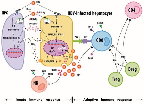 A schematic diagram summarizing the altered innate and adaptive immune responses in HBV-infected patients. Toll-like receptors (TLRs) are expressed in hepatocytes and hepatic nonparenchymal cells (NPCs), including liver sinusoidal endothelial cells, Kupffer cells, and dendritic cells. During viral infection, the stimulation of TLRs by their respective ligands leads to the activation of downstream myeloid differentiation protein 88 (MyD88) and toll/interleukin receptor domain-containing adaptor protein, inducing interferon-β (TRIF)-dependent signaling pathways in hepatic cells and NPCs and the production of proinflammatory cytokines, chemokines, and IFNs. However, HBV and its proteins (HBsAg, HBV core, HBe protein, HBc/e, HBx protein, and HBV polymerase (pol)) might downregulate TLR and downstream signaling, and HbsAg might inhibit natural killer (NK) cells and CD8 cells. The expression of programmed cell death protein 1 (PD-1), T-cell immunoglobulin and mucin domain-containing 3 (Tim-3), killer cell lectin-like receptor G1 (KLRG1), and lymphocyte activating 3 (LAG3) on CD8+ T cells illustrates the exhausted status of CD8+ T cells upon HBV infection. With interleukin 10 (IL-10) and transforming growth factor beta (TGFβ), regulatory T cells (Tregs) and regulatory B cells (Bregs) inhibit CD8+ T cell and CD4+ T cell function, and HBV proliferation subsequently accelerates. MAPK: mitogen-activated protein kinase; NF-κB nuclear factor κB; IRF-1: interferon-regulatory factor 1; IFNs: interferons; cccDNA: covalently closed circular DNA; PD-L1: programmed cell death ligand 1; JAK-STAT: Janus kinase-signal transducer and activator of transcription; LLT1: lectin-like transcript 1; MICA: MHC class I polypeptide-related sequence A.
