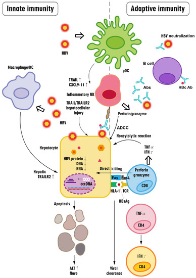 The cascade of innate and adaptive immune responses in HBV flares is summarized in Figure 3.