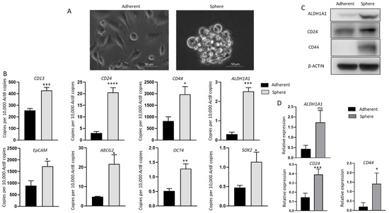 Anchorage-independent 3-dimensional spheroid culture enriches CSC population in NOZ cells. (A) Monolayer culture and 3-D culture of NOZ cells. (B) Reverse transcription-quantitative (RT-q) PCR analysis demonstrated higher expression of embryonic stemness and CSC markers in NOZ spheres compared to adherent monolayers. (C,D) Western blots demonstrated the upregulation of ALDH1A1, CD24, and CD44 in NOZ spheres. * p < 0.05, ** p < 0.01, *** p < 0.005, **** p < 0.001, ns—not significant.