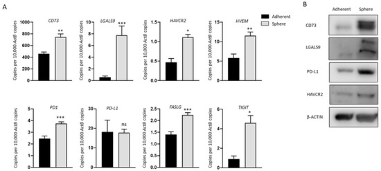 Immune modulators are upregulated in NOZ stem-like population. (A) RT-qPCR showed immune modulators CD73, LGALS9, HAVCR2, HVEM, PD1, PD-L1, FASLG, and TIGIT were upregulated in NOZ spheres compared to its parental adherent cells. (B) Western blots demonstrated the increase of CD73, LGALS9, PD-L1, and HAVCR2 in NOZ spheres. * p < 0.05, ** p < 0.01, *** p < 0.005, ns—not significant.