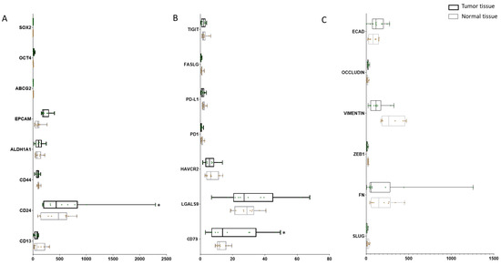 Expression of CSC markers and immune modulators varied from tumor and para-tissues in GBC patients. (A) Expression level of CSC markers SOX2, OCT4, ABCG2, EPCAM, ALDH1A1, CD44, CD24, and CD13 in matched tumor and para-tumor tissues in GBC patients. (B) Expression level of immune checkpoints TIGIT, FASLG, PD-L1, PD1, HAVCR2, LGALS9, and NT5E in matched tumor and para-tumor tissues in GBC patients. (C) Expression level of EMT markers ECAD, OCCLUDIN, VIMENTIN, ZEB1, FN, and SLUG in matched tumor and para-tumor tissues in GBC patients. * p < 0.05.