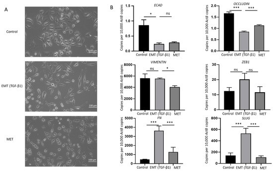 TGF-β1 induces reversible epithelial to mesenchymal transition (EMT) in NOZ cells. (A) Representative images of NOZ cells before and after incubating with TGF-β1 and after withdrawal of TGF-β1 under an inverted phase contrast microscope at ×200 magnification. (B) RT-qPCR showed TGF-β1 decreased expression of ECAD and OCCLUDIN and increased expression of VIMENTIN, ZEB1, FN, and SLUG. Withdrawal of TGF-β1 induced MET consistent with elevated expression of ECAD and OCCLUDIN and decreased expression of VIMENTIN, ZEB1, FN, and SLUG. * p < 0.05, *** p < 0.005, ns—not significant.