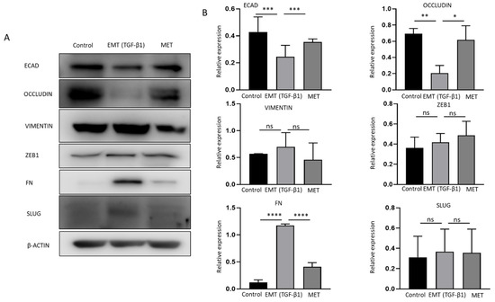Reversible epithelial to mesenchymal transition (EMT) is mediated by TGF-β1 in NOZ cells. (A,B) Western blot analysis showed TGF-β1 decreased expression of ECAD and OCCLUDIN and increased expression of VIMENTIN, ZEB1, FN, SLUG. Withdrawal of TGF-β1 induced MET consistent with elevated expression of ECAD and OCCLUDIN and decreased expression of VIMENTIN, ZEB1, FN, and SLUG. * p < 0.05, ** p < 0.01, *** p < 0.005, **** p < 0.001, ns—not significant.