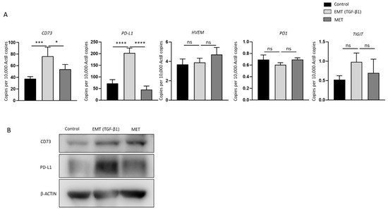 Expression of immune checkpoints CD73 and PD-L1 correlates with EMT-MET status of NOZ cells. (A) RT-qPCR demonstrated upregulation of immune checkpoint molecules CD73 and PD-L1 in EMT-induced NOZ cell. A reduction in expression of CD73 and PD-L1 was observed following reversal assay. No significant change in the expression of HVEM, PD1, and TIGIT was noted during EMT or MET. (B) Protein expression level of CD73 and PD-L1 as observed by Western blot matched mRNA expression level. * p < 0.05, *** p < 0.005, **** p < 0.001, ns—not significant.