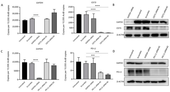 siRNA-mediated knockdown assay effectively represses CD73 and PD-L1 expression in NOZ cells. NOZ cells were transfected with CD73 or PD-L1 siRNA, untransfected, scrambled siRNA, and GAPDH siRNA as controls. Effective knockdown of CD73 was detected by RT-qPCR (A) and Western blot (B). PD-L1 expression significantly reduced following treatment with PD-L1 specific siRNAs as detected by RT-qPCR (C) and Western blot (D). *** p < 0.005, **** p < 0.001.