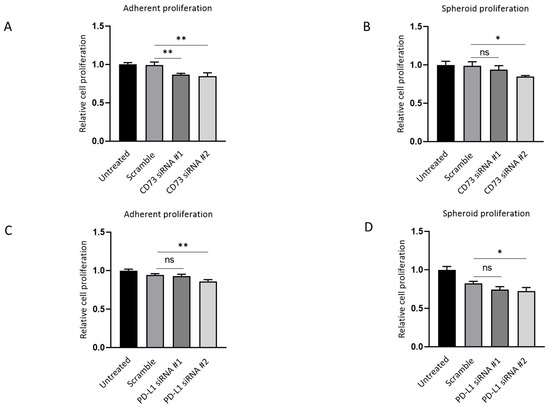 Next, the effect of depleting CD73 and PD-L1 on cell growth in both adherent monolayers and spheroids was evaluated. CD73 knockdown resulted in ~15% inhibition of both adherent and spheroid proliferation compared with the scrambled siRNA control, as assessed by MTS assay (Figure 8A,B). CD73 siRNA #1-treated cells did not show significant suppression in spheroid proliferation compared with the scrambled control (Figure 7B). PD-L1 #2 knockdown led to ~10% repression of adherent and spheroid proliferation as compared with the scramble (Figure 8C,D).