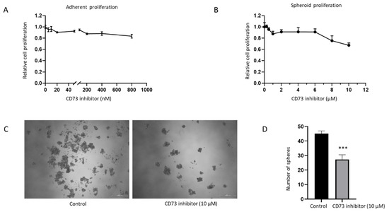 NOZ cell line was not sensitive to CD73 inhibitor PSB 12379 at the physiological concentration range. MTS assays indicated no reduced proliferation of adherent monolayer cells upon CD73 inhibitor treatment (A). Higher doses of CD73 inhibitor reduced proliferation of anchor-age-independent 3D spheres (B). Photomicrographs of NOZ spheres on day 7 treated with or without 10 µM CD73 inhibitor (C). NOZ spheres numbers were enumerated in control and CD73 inhibitor treatment conditions (D). *** p < 0.005.