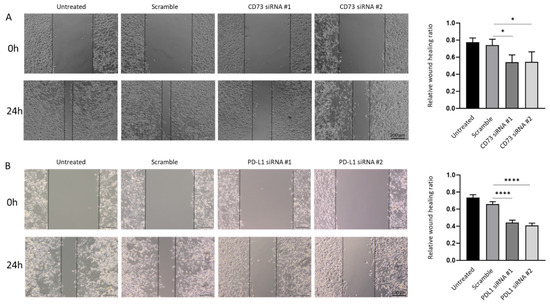 CD73 and PD-L1 is involved in wound healing ability of NOZ cells. Scar healing assay (24 h) demonstrated CD73 (A) and PD-L1 (B) knockdown slowed wound healing as compared to control cells. Bar charts show the ratio of the reduction of the scar length compared to the initial scar length (×200 magnification). * p < 0.05, **** p < 0.001.