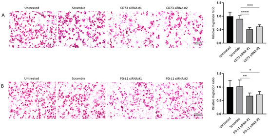 Cell migration assay was performed in 24-well Transwell plates with 8.0 µm pore polycarbonate membrane insert (Corning). Non-transfected, scrambled-, PD-L1- or CD73- siRNA transfected cells were seeded in the upper chambers at 2 × 104 cells per insert in 100 µL medium containing 1% FBS. The bottom chambers were filled with 650 µL medium with 10% FBS. After 24 h incubation, the inserts were transferred into a new 24-well plate, fixed with PFA and stained with crystal violet. Non-migrated cells in the upper inserts were removed carefully using cotton swabs and the migrated cells were then photographed using an Olympus microscope.