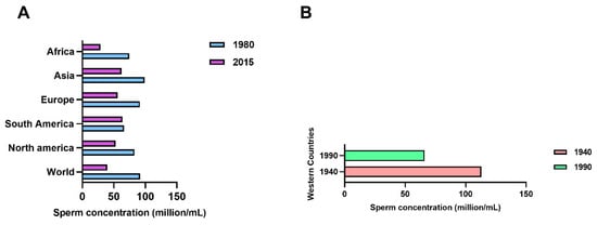 Decrease rates of sperm concentration worldwide. Sperm concentration declines in several areas of the world from 1980 to 2015 (A), and from 1940 to 1990 (B).