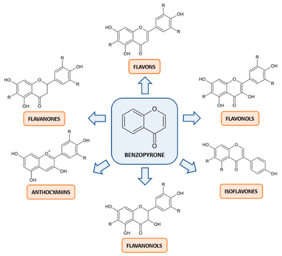 Flavonoids are the most prevalent and well-studied polyphenols in human diet. The common scaffold within this class of compounds is the benzo-pyrone moiety, which can be variously substituted. Based on the degree of oxidation or unsaturation, flavonoids can be classified into six major subclasses: flavonols, flavones, flavanones, flavanonols, anthocyanins and isoflavones (Figure 2). They are more frequently found as glycosides, although it is likely to find them as aglycone.