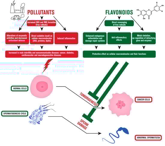 Effects of flavonoids against environmental pollutant-induced carcinogenesis and male infertility. Physiological processes of normal cells can be altered by pollutants leading to cancer and sperm cell damage. Flavonoids can protect cellular functions from environmental insults via targeting a wide plethora of mechanisms.