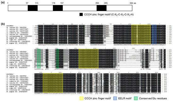 Protein domain of AtC3H12 and multiple alignment among AtC3H12 and its orthologs. (a) CCCH zinc finger motifs of AtC3H12. CCCH zinc finger motifs are represented as black boxes. (b) Multiple-sequence alignment was performed using the ClustalW2 program with amino acid sequences of AtC3H12 and its orthologs. Three conserved CCCH zinc finger motifs are annotated as yellow boxes. Black-, dark-gray-, and light-gray-shaded amino acids represent 100%, 80%, and 60% conservation rate, respectively. Blue and green boxes represent the EELR motif and conserved Glu residues, respectively. * display positions which have a single, fully conserved residue. The GI number of each protein sequence is as follows: AtC3H12, 840128; A. lyrata, 9329782; C. sativa, 104777267; C. sativa, 104757605; C. rubella, 17899247; C. sativa, 104741835; E. salsugineum, 18991820; B. napus, 106437497; B. rapa, 103874741; B. oleracea, 106296110; B. napus, 106352957.