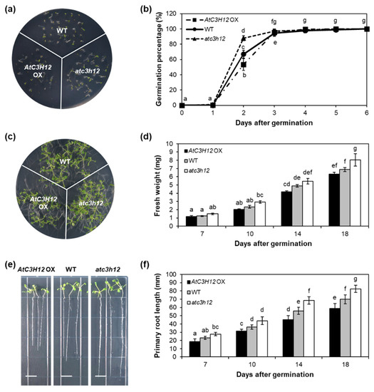 To study the biological functions of AtC3H12, we generated AtC3H12-overexpressing transgenic plants (OXs) and selected homozygous atc3h12 mutants (Figures S1 and S2). First, seed germination was analyzed. Seeds of AtC3H12 OX plants germinated significantly slower than those of WT plants, whereas atc3h12 mutants germinated faster than WT (Figure 2a,b and Figure S3a,b). In particular, the germination percentage of AtC3H12 OXs and atc3h12 mutants was significantly lower and higher, respectively, than that of the WT 2 days after germination (DAG) (Figure 2b and Figure S3b). However, the final germination percentage did not differ among AtC3H12 OXs, atc3h12 mutants, and WT (Figure 2b and Figure S3b). During seedling development from 7 to 18 DAG, AtC3H12 OX seedlings were smaller and lighter than WT seedlings (Figure 2c,d and Figure S3c,d). In contrast, atc3h12 seedlings were heavier and larger than WT seedlings (Figure 2c,d). In particular, the increase in fresh weight (FW) from 10 to 14 DAG in atc3h12 mutants was higher than that of WT (Figure 2d). In addition, we found that the primary root length of AtC3H12 OXs was shorter than that of WT, whereas the primary root length of atc3h12 mutants was longer than that of WT from 7 to 18 DAG (Figure 2e,f and Figure S3e,f). These results indicate that AtC3H12 has a negative role in seed germination and seedling development.