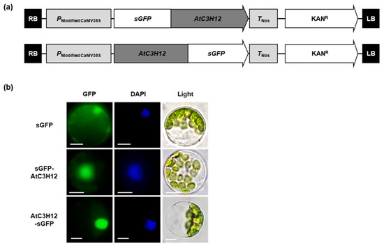We studied the subcellular localization of the AtC3H12 protein in Arabidopsis protoplasts using N-terminal (sGFP-AtC3H12) and C-terminal (AtC3H12-sGFP) synthetic green fluorescent protein (sGFP)-fused AtC3H12 constructs to determine the potential molecular function of the protein (Figure 3a). As a result, GFP signals of sGFP-AtC3H12 and AtC3H12-sGFP constructs were exclusively observed in the nucleus (Figure 3b), indicating that AtC3H12 may exert its functions in the nucleus.