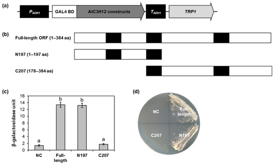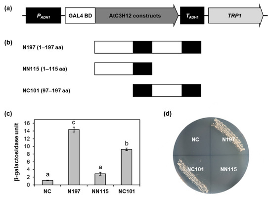 Transactivation activity assay of N197 of AtC3H12 in yeast. (a) Schematic map of the GAL4 BD-fusion vector for transactivation activity assay in yeast. (b) Schematic maps of N197, NN115, and NC101 of AtC3H12 for transactivation activity assay. (c) Quantitative β-galactosidase ONPG assay. β-Galactosidase activities were measured to quantify the transactivation activities. Error bars display standard deviation (n = 3). Different letters display significant differences (p < 0.05). (d) Yeast growth assay. Yeast transformants were grown on SD-Trp/-Ura. In (c,d), empty pBD-GAL4 vector was used for a negative control. NC, negative control.
