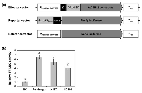 Transactivation activity assay of AtC3H12 in Arabidopsis protoplasts. (a) Schematic maps of the effector vector, reporter vector, and reference vector for transactivation activity assay. (b) Relative firefly luciferase (FF LUC) activities of full-length ORF, N197, and NC101 of AtC3H12 in Arabidopsis protoplasts. The reference vector was used for the normalization of transformation efficiency. The empty effector vector was used for a negative control. Normalized FF LUC activity of negative control was set to 1. Error bars display standard deviation (n = 3). Different letters display significant differences (p < 0.05).