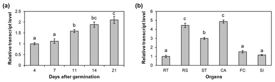 We examined the expression patterns of AtC3H12 in different developmental stages and organs by quantitative RT-PCR (RT-qPCR). The AtC3H12 transcript level was slightly elevated as the seedlings developed from 4 to 21 days after germination (DAG) (Figure 7a). In mature plants, cauline leaves and rosette leaves showed a higher level of AtC3H12 transcripts than other organs, such as roots, stems, floral clusters, and siliques (Figure 7b).