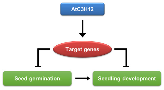 Collectively, our data propose that AtC3H12 containing three CCCH zinc finger motifs acts as a nuclear transcriptional activator to regulate the transcription of genes that negatively modulate seed germination and seedling development in Arabidopsis (Figure 9).