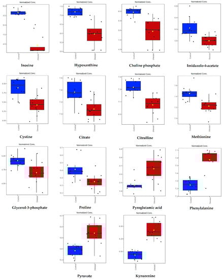 Concentrations of metabolites significantly altered in dogs infected with B. canis determined by the targeted LC-MS metabolomics approach. Data are presented as box and whiskers plot (mean ± SD). All metabolites shown demonstrated a statistically significant difference between groups by t-test (p < 0.05). Blue-control samples, red-disease samples.