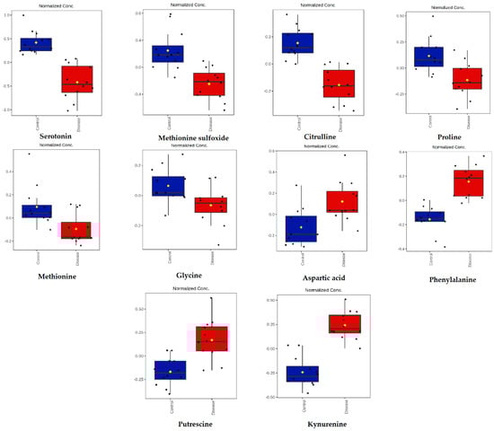 Serotonin, methionine sulfoxide, citrulline, proline, methionine, and glycine were lower, while aspartic acid, phenylalanine, putrescine, and kynurenine were higher in dogs infected with B. canis (Figure 3).