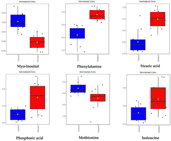 Concentrations of metabolites significantly altered in dogs infected with B. canis and generated by the GC-MS metabolomics approach. Data are presented as box and whiskers plot (mean ± SD). All metabolites shown demonstrated a statistically significant difference between groups by t-test (p < 0.05). Blue-control samples, red-disease samples.