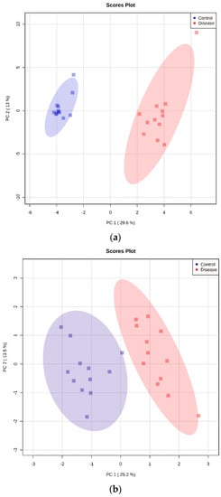 Raw LC-MS data obtained from each sample were analyzed with the MSconvert tool (ProteoWizard Software Foundation, San Diego, CA, USA) and the Polyomics integrated Metabolomics Pipeline (PiMP) available at http://polyomics.mvls.gla.ac.uk (accessed on 9 March 2021)—using a standard protocol and default parameters []. Raw data were converted from the Thermo Scientific ‘RAW’ file format to an ‘mzXML’ file format, centroided, and split into positive and negative polarities using ProteoWizard software [] and imported into PiMP. A mixture of 148 authentic compounds was run at the beginning and the end of the sample batch to allow for metabolite identification (MSI level 1). Metabolite identification was performed in PiMP, according to the metabolomics standards initiative (MSI) guidelines, by matching mass and retention times of detected peaks with authentic standards, while annotations were made when matching to a metabolite by accurate mass only using metabolite libraries search (e.g., The Human Metabolome Database, HMDB, available at https://hmdb.ca/, (accessed on 5 May 2021)) and/or Kyoto Encyclopedia of Genes and Genomes, KEGG, available at https://www.genome.jp/kegg/, (accessed on 5 May 2021)) integrated within the PiMP standard procedure.
