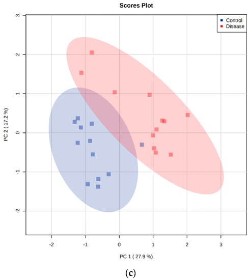 Principal component analysis (PCA) score plots were performed using 24 serum samples of dogs by untargeted LC-MS metabolomics analysis (a), targeted LC-MS metabolomics analysis (b), and GC-MS metabolomics analysis (c). The first two principal components (PCs) explained 426% for the untargeted LC-MS metabolomics, 387% for the targeted LC-MS metabolomics, and 451% of the total variance for the GC-MS metabolomics.