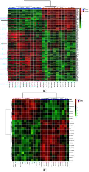 Heat maps visually represent the differentially abundant metabolic features/metabolites and the alteration in serum metabolome between healthy dogs and dogs infected with B. canis. Hierarchical clustering analysis was performed on the peak intensity data obtained from untargeted LC-MS analysis and concentration data from targeted LC-MS analysis and GC-MS analysis. The results that referred to two main clusters were related to the compared samples and metabolic features/metabolites using Euclidean as a distance measure and ward as a clustering algorithm. The metabolites were ranked by t-test (p < 0.05). Figure 6 shows correct sample group clustering for the untargeted and targeted LC-MS metabolomics and GC-MS metabolomics.