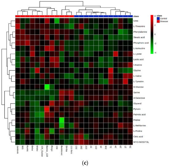 The heat map of the metabolic features in the untargeted LC-MS metabolomics (a), targeted LC-MS metabolomics (b), and GC-MS metabolomics (c). Red color represents the increased level of each metabolite, while blue color represents the decreased level of each metabolite in dogs infected with B. canis versus control dogs. Blue panel-control samples, red panel-disease samples.