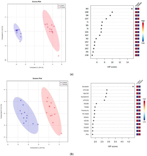 A partial least squares-discriminant analysis (PLS-DA) was performed to identify metabolites that were the most discriminant between healthy dogs and dogs with babesiosis. The PLS-DA plots represented a clear intergroup separation between the two experimental groups. From the PLS-DA, the differentiation between healthy dogs and dogs with babesiosis occurred along component 1, measured as 29.5% for the untargeted LC-MS metabolomics, 24.9% for the targeted LC-MS metabolomics, and 25.8% for the GC-MS metabolomics, respectively (Figure 7a–c left panels). The validity of PLS-DA was confirmed by cross-validation and showed that the best classifier model comprised five components (R2 = 0.98946, Q2 = 0.96356) for untargeted metabolomics, (R2 = 0.99933, Q2 = 0.86175) for targeted metabolomics, and (R2 = 0.92723, Q2 = 0.8097) for GC-MS metabolomics. The overall VIP scores of the PLS-DA results produced the list of the 15 most important variables contributing to the separation in the PLS-DA plot. These variables are ranked by variable importance in the projection (VIP). The colored boxes on the right indicate the relative concentrations of the corresponding metabolite in each studied group. Some of the important metabolites identified by this separation included the following: inosine (peak 1280, 290), hypoxanthine (peak 70, 1241), and choline phosphate (peak 352) for the untargeted LC-MS metabolomics; serotonin, methionine-sulfoxide (Met-SO), kynurenine, putrescine, and phenylalanine for the targeted LC-MS metabolomics; and stearic acid, phenylalanine, myo-inositol, phosphoric acid, methionine, galactose, and isoleucine for the GC-MS metabolomics (Figure 7a–c right panels).