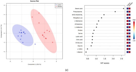 Partial least squares-discriminant analysis (PLS-DA) score plots were performed in 24 analyzed serum samples from control group and group of dogs infected with B. canis by untargeted LC-MS metabolomics analysis (a), targeted LC-MS metabolomics analysis (b), and GC-MS metabolomics analysis (c) (left panels). The list of the 15 important compounds/metabolites was identified by PLS-DA according to the variable importance on projection (VIP) score (right panels). The intensity of the colored boxes on the right represents the relative abundance of the corresponding metabolite in each group (blue-control, red-disease).