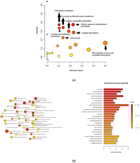 Pathway analysis and Metabolite Set Enrichment Analysis was performed with MetaboAnalyst v.4.0. (http://www.metaboanalyst.ca, accessed on 14 September 2021) using significant joint metabolites identified by untargeted and targeted metabolomics approach. A hypergeometric test and relative-betweenness centrality were used for the pathway-enrichment analysis and the pathway-topology analysis, while homo sapiens (humans) was selected as the pathway library. The pathway-associated metabolite sets (SMPDB; 99 metabolite sets based on normal human metabolic pathways) was selected as the pathway library for Metabolite Set Enrichment Analysis (MSEA).