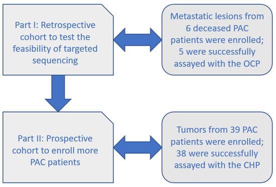 The enrollment criteria were adult patients (more than 20 years old) with pathology-confirmed PAC. Neuroendocrine tumors with pancreatic origin were excluded. In the first part (retrospective cohort), we took advantage of readily available formalin-fixed paraffin-embedded (FFPE) specimens of metastatic lesions from deceased patients with PAC to evaluate the feasibility of extracting nucleic acids for targeted sequencing (enrollment period: from March 2011 and August 2013). The OCP v1 was used as the initial screening tool for detecting tumor genetic alterations and could be used as a candidate for downstream analyses. In the second part (prospective cohort), more samples were collected to elucidate the oncogenesis of Taiwanese patients with PAC using the CHP v2 panel (enrolled between November 2013 and August 2016). Figure 1 shows the whole study workflow. Planned sample size was 6 for part I (retrospective cohort) and 39 for part II (prospective cohort), with a total of 45 Taiwanese patients with PAC. For part I, readily available archived FFPE samples from deceased patients with PAC were the source of assayed samples, while for part II, prospective enrollment was carried out for Taiwanese patients with PAC.