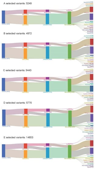 Six FFPE PAC specimens were retrieved and tested in part I (retrospective cohort, Figure 1) of the study, five of which had adequate DNA/RNA for the Oncomine Comprehensive Panel v1 (OCP, Thermo Fisher Scientific, Waltham, MA, USA). These metastatic samples were from deceased PAC patients, including two from lymph nodes, two from malignant effusion, and one from liver metastasis. Approximately 150 to 200 unfiltered variants of different types were found in each sample (Table 1), many of which were probable passengers. Most Taiwanese patients with PAC harbored KRAS mutations, as previous studies have shown []. There was one FGFR2 mutant case. The distribution of CNVs found in this study is detailed in Figure 2. Variant calling using the Partek Flow software with SAM tools (Partek Incorporated, St. Louis, MO, USA) was used to draw Sankey diagrams of the five assayed samples (Figure 3). Supplementary Figure S1 shows a variant impact heatmap of 5 PAC samples assayed with the OCP. At least one actionable mutation was reported for each case (Table 1).