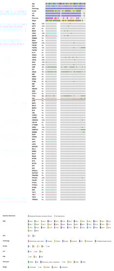 Singhi et al., conducted by far the largest study on approximately 3600 samples of PAC and found that the most frequently mutated genes, i.e., KRAS, TP53, CDKN21, and SMAD4 cannot be targeted with readily available existing drugs []. In 2020, the FDA approved olaparib for maintenance treatment of germline BRCA-mutated metastatic PAC whose disease has not progressed on at least 16 weeks of first-line platinum-based chemotherapy based on a phase III POLO trial []. The most common pathogenic germline mutations are in BRCA1, BRCA2, and ATM and, more rarely, in PALB2, MLH1, MSH2, MSH6, PMS2, CDKN2A, and TP53, among others, for an aggregate frequency of 3.8% to 9.7% [,]. Although only somatic alterations were investigated in the current study, several aberrant DNA damage repair genes were reported from Taiwanese patients with PAC, and reflux germline testing should be indicated based on alterations in tumor-only sequencing.