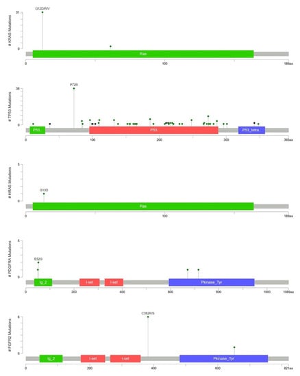 To further integrate the findings from both parts of the study, Figure 4 and Figure 5 show the OncoPrinter plots of 43 Taiwanese patients with PAC with and without excluding germline mutations and alterations of unknown significance. Figures S3 and S4 show the corresponding OncoPrinter plots from 176 PACs from The Cancer Genome Atlas (TCGA) Firehose Legacy after excluding 8 cases of pancreatic neuroendocrine tumors [,]. The most prevalent mutations (more than 50% of the study cohort, after excluding germline and unknown alterations) came from KRAS (74%), followed by KDR (59%) and TP53 (56%, Figure 5). Figure 6 shows MutationMap plots of KRAS, TP53, HRAS, PDGFRA, and FGFR2. Hotspot mutation of KRAS G12D was prominent, while the distribution of TP53 mutations was much more even, except for P72R. The HRAS G13D mutation was likely oncogenic, while functional impact of PDGFRA mutations remained unknown. Although not fully investigated, FGFR2 C382S was considered likely oncogenic as C382R, which had been annotated as such.