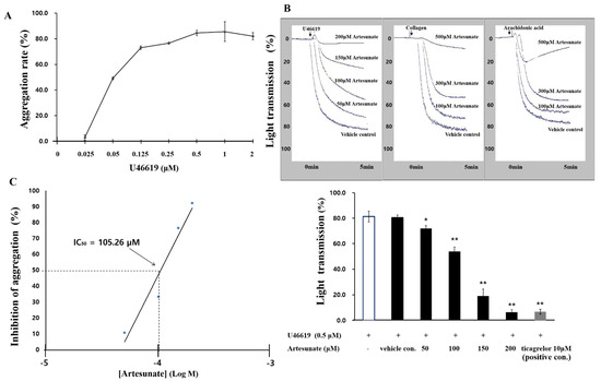 Artesunate’s effect on platelet aggregation induced by U46619. (A) The U46619 threshold dose on human platelet aggregation. (B) Artesunate’s effect on platelet aggregation. (C) IC50 value of artesunate on platelet aggregation induced from U46619. The results are shown as mean ± SD (n = 4). * p < 0.05, ** p < 0.001 in comparison to the U46619−induced vehicle control.