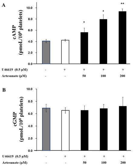 For 3 min, incubation of the suspended platelets (108 cells/mL) occurred at 37 °C while adding different artesunate concentrations, then 2 mM CaCl2 was added with U46619 (0.5 μM) for stimulation at a duration of 5 min. Termination of the reaction occurred by adding 1 M HCl, and a Synergy HT Multi-Reader (BioTek Instruments, Winooski, VT, USA) measured cGMP/cAMP using the cAMP or cGMP EIA kit.