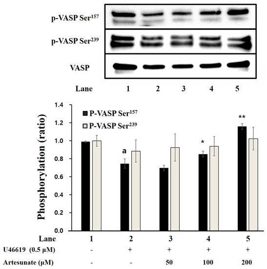 As artesunate increased the cAMP production in platelets induced with U46619 (Figure 3), we examined artesunate’s effect on the phosphorylation of cGMP-dependent VASP Ser239 and cAMP-dependent VASP Ser157 in platelets induced with U46619. As shown in Figure 4, VASP Ser157 was significantly increased by artesunate, but VASP Ser239 was not. In particular, the results confirmed that, with 100 μM or more, significance is apparent, which indicates that cAMP production increased by artesunate significantly increased the VASP Ser157 phosphorylation.
