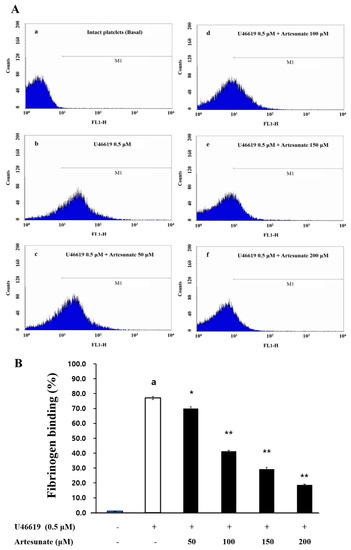 Artesunate’s effects on the binding of fibrinogen. (A) The histograms of flow cytometry on the binding of fibrinogen. (a) Intact platelets (base); (b) U46619 (0.5 μM); (c) U46619 (0.5 μM) + artesunate (50 µM); (d) U46619 (0.5 μM) + artesunate (100 µM); (e) U46619 (0.5 μM) + artesunate (200 µM); (f) U46619 (0.5 μM) + artesunate (300 µM). (B) Artesunate’s effect on the binding (%) of fibrinogen induced by U46619. After treatment with Alexa Fluor 488-human fibrinogen (30 μg/mL) by adding 2 mM CaCl2 to the suspended platelets (108 cells/mL), U46619 (0.5 μM) was used for stimulation at a duration of 5 min. After adding phosphate-buffered saline (PBS, pH 7.4) containing 0.5% paraformaldehyde, the reaction was terminated. Light blocking was used during this process and a flow cytometer (FACS) measured fibrinogen binding. The results are shown as mean ± SD (n = 4). a p < 0.05 in comparison to non−stimulated platelets, * p < 0.05, ** p < 0.001 in comparison to the U46619−induced platelets.