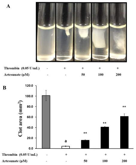 Platelet activation and aggregation occurs through platelet inducers, and over time, signal transduction via the external pathway causes the formation of fibrin clot. Accordingly, the present study investigated artesunate’s effect on platelets-mediated fibrin clot retraction by thrombin induction. As demonstrated in Figure 8A, fibrin clot was strongly formed by thrombin, and artesunate (50, 100, and 200 μM) concentration-dependently inhibited thrombin-induced fibrin clot retraction. The inhibition rates of artesunate (50, 100, and 200 μM) were confirmed to be 11.7%, 37.8%, and 58.8%, respectively (Figure 8B). These results show that artesunate can actually inhibit thrombus formation.