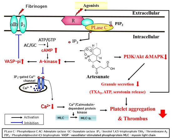 With this study, artesunate strongly inhibited fibrinogen binding to αIIb/β3 in platelets induced with U46619. It is thought that the increased cAMP production by artesunate caused the activation of PKA and phosphorylated PKA-dependent VASP Ser157, which caused fibrinogen binding to αIIb/β3 to be inhibited. In the future, further research will need to explore the mechanism by which artesunate caused a cAMP production increase. cAMP and cGMP are known to depend on adenylyl cyclase/guanylyl cyclase or cyclic nucleotide phosphodiesterase (PDE) activation [36]. Being that there is an increase in levels of cyclic nucleotides during the aggregation of platelets via PDE activity inhibition, inhibitors of PDE have been shown to have therapeutic effects on thrombosis [37]. As a matter of fact, PDE inhibitors (cilostazol, dipyridamole, and triple rusal) have served as antiplatelet agents to clinically increase cyclic nucleotide production [9]. It is thought that artesunate could be developed as an antiplatelet drug with a comparable function.