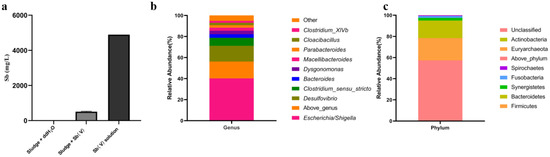 The removal of Sb in municipal sludge after 14-day incubation (a) and the community composition of SRB enriched community at the genus (b) and phylum levels (c).