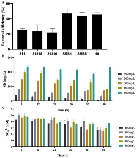 The Sb-removal efficiency of all SRB strains within 24 h (a), the performance of SRB49 on Sb removal (b) and sulfate consumption (c) within 48 h in different Sb(V) concentrations.