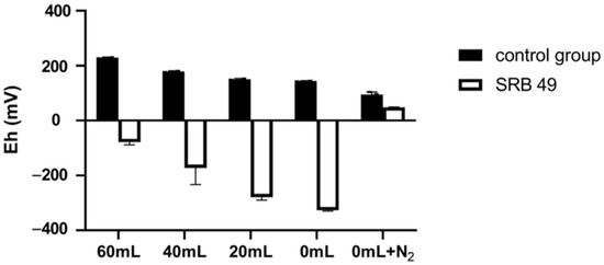The redox potential in the synthetic wastewater with different upper air after incubated with and without SRB49 for 48 h.