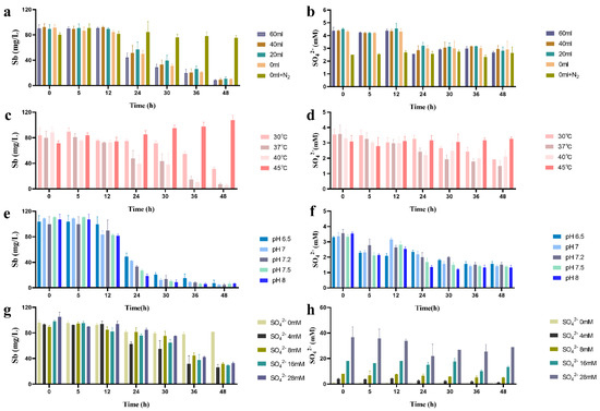 Sb-removal (a,c,e,g) and sulfate consumption (b,d,f,h) by SRB49 under different culture parameters.