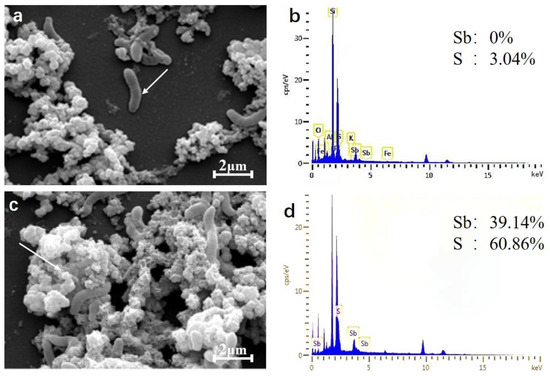 The precipitates after incubation with SRB49 for 48 h were characterized by scanning electron microscopy-energy dispersive X-ray (SEM-EDX) (Figure 6). The SRB bacteria were entangled with amorphous precipitates that were typically less than 1 µm in diameter (Figure 6a,c). The energy dispersive X-ray (EDX) analysis on the surface of the bacteria showed that there was no Sb element on the bacterial surface (Figure 6a,b), suggesting that the bacteria did not absorb any Sb. EDX analysis of the precipitates of SRB49 detected the Sb and S peaks and found that the ratio of Sb/S was approximately 2:3 (Figure 6c,d), which indicated the formation of Sb2S3.