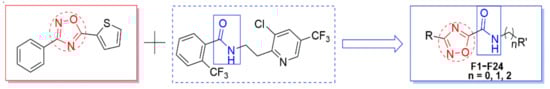- Zhang, M.M.; Sun, J.X.; Xu, Z.L.; Wang, M.H. Development of a novel type of 3,5-disubstituted-1,2,4-oxadiazole insecticide. Mod. Agrochem. 2018, 18, 18–20. [Google Scholar] [CrossRef]